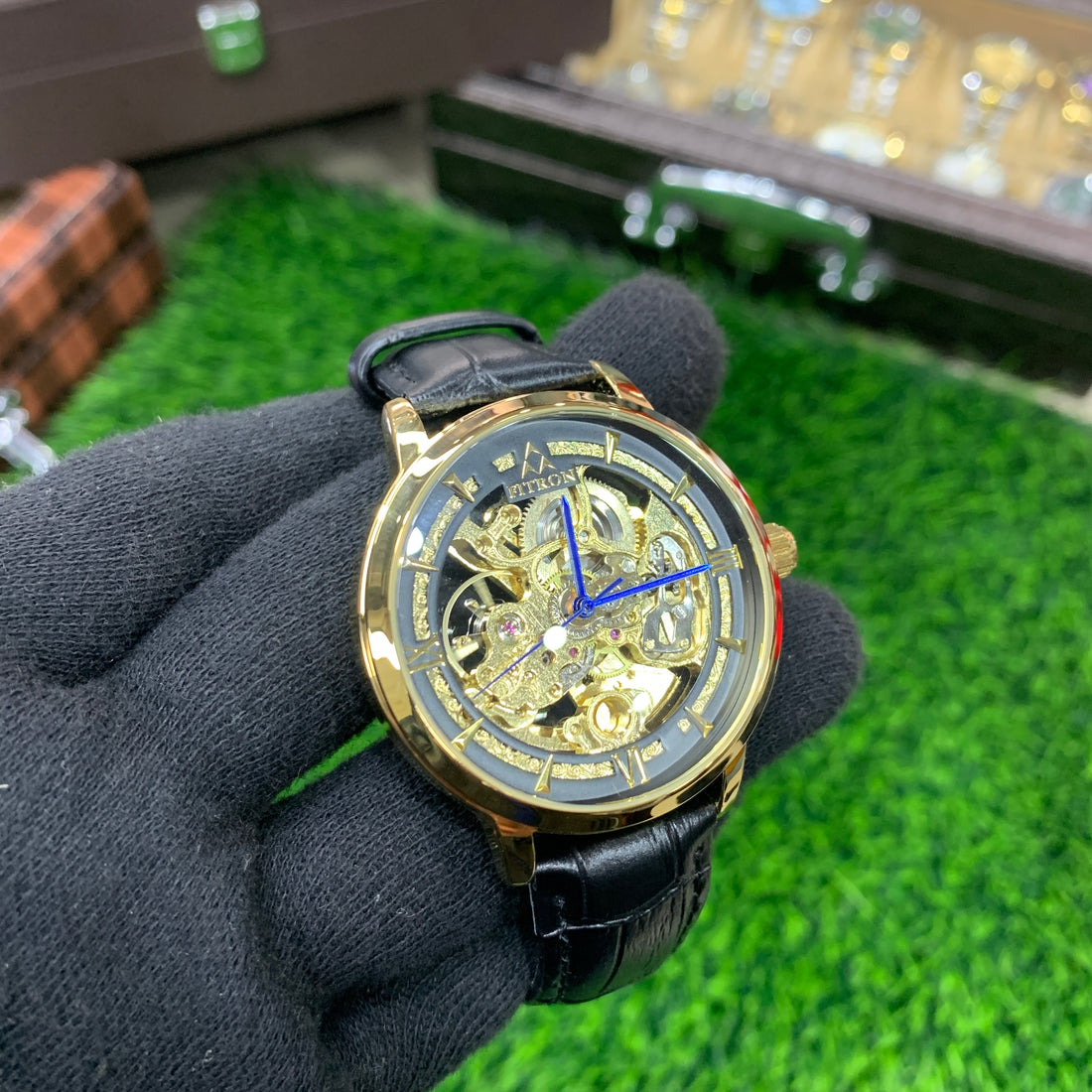 FITRON Automatic Skeleton Watch for Men β Black Leather Strap (Black Dial)