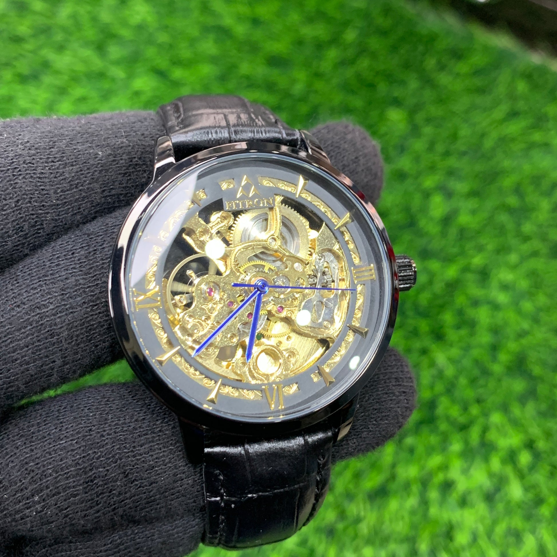 FITRON Automatic Skeleton Watch for Men β Black Leather Strap (Full Black Dial)