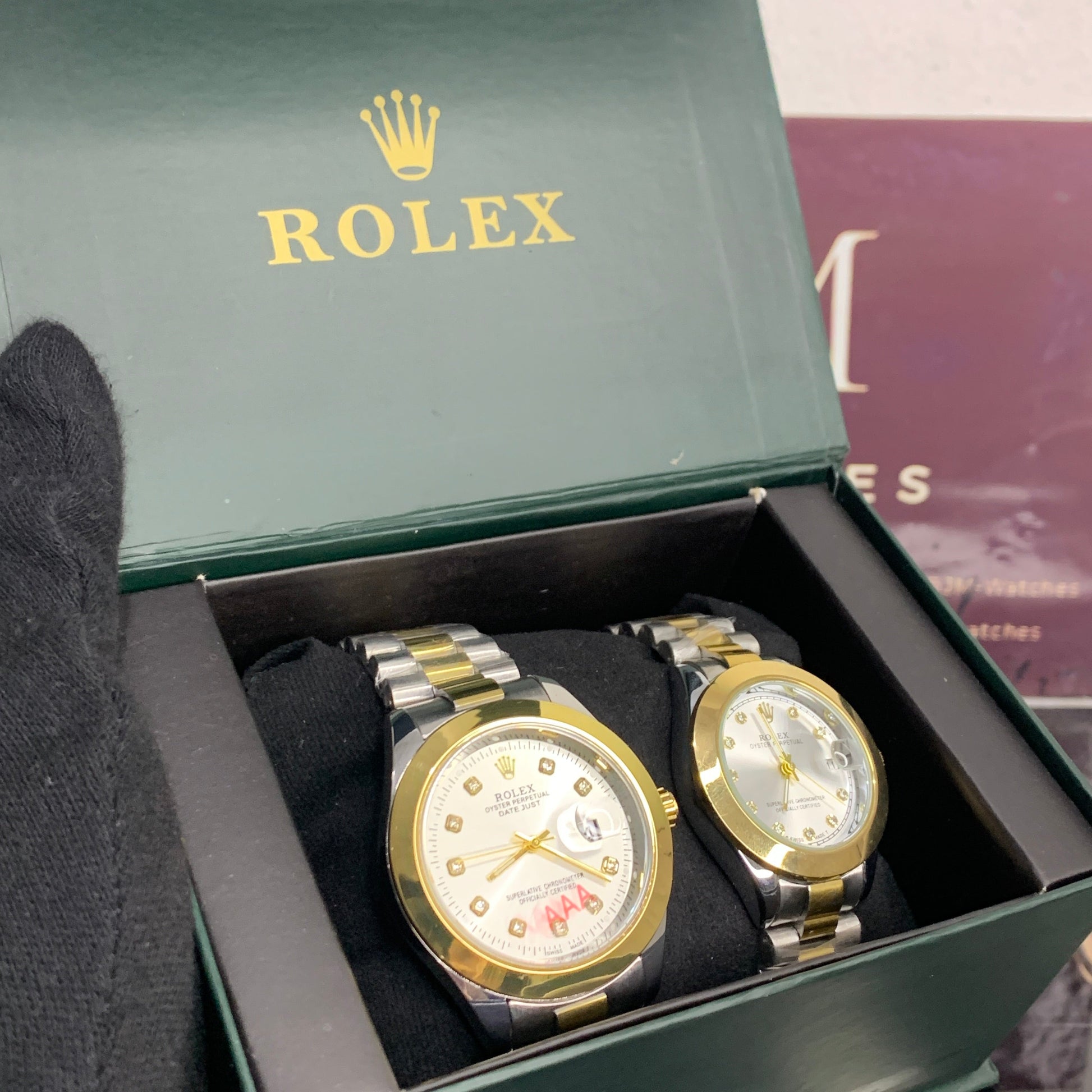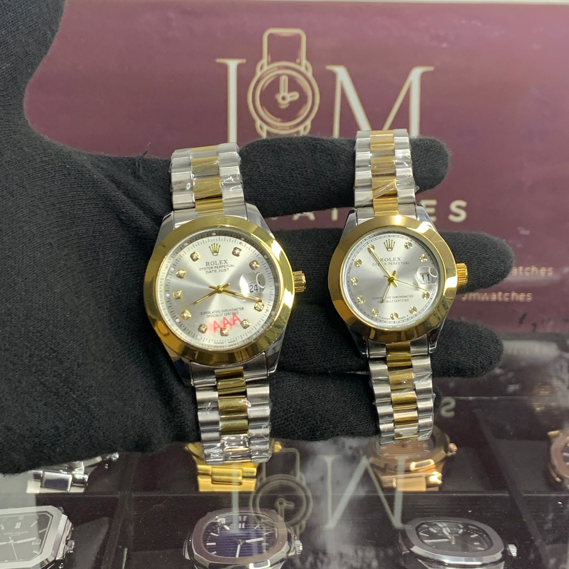 Matching pair of 40 mm two-tone stainless steel watches with a polished silver-and-gold finish—designed to harmonize elegantly