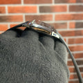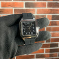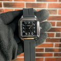 Silver-tone hands glide gracefully across the dial, and a small crown at 3 oβclock allows for easy adjustment. The slim profile of the case ensures it slips effortlessly under a shirt cuff, but its distinctive shape still makes a statement on the wrist. With its blend of sporty materials and sophisticated aesthetics, this watch is a versatile companion for any wardrobe.