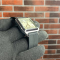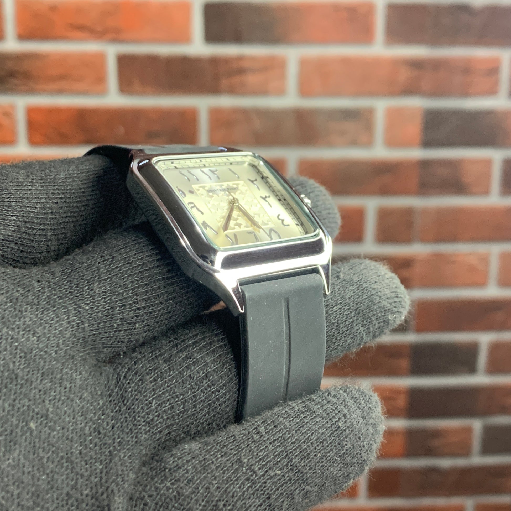 Silver-tone hands glide gracefully across the dial, and a small crown at 3 oβclock allows for easy adjustment. The slim profile of the case ensures it slips effortlessly under a shirt cuff, but its distinctive shape still makes a statement on the wrist. With its blend of sporty materials and sophisticated aesthetics, this watch is a versatile companion for any wardrobe.